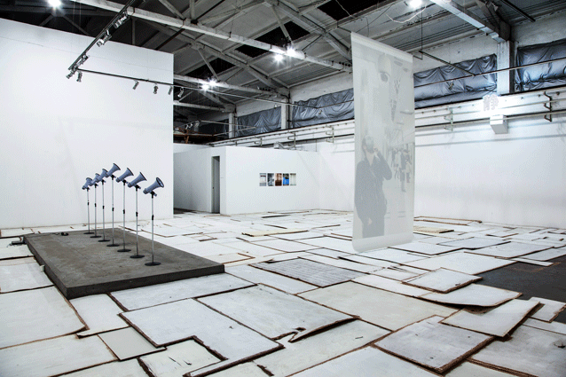 Left side: Beate Engl's & Leonie Felle's I feel like a readymade (propagand version), audio-installation and performance with 7 megaphones, gallery bottom: Thomas Thiede's Arena, wood and paint